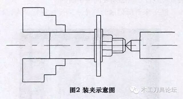 加工一根芯棒,見(jiàn)圖2,階臺(tái)處直徑略小于薄片砂輪孔徑 0.1~0.3 mm,將薄片砂輪安裝其上 ,兩側(cè)放有橡膠墊片 ,用螺母旋緊 ,芯棒后端用尾架支承,這樣 ,車(chē)床主軸轉(zhuǎn)動(dòng)時(shí) ,帶動(dòng)砂輪片做高速運(yùn)動(dòng) ,形成切削運(yùn)動(dòng)的主運(yùn)動(dòng) 。